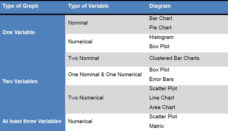 In the following table we present a list of graphs suitable for the study of variables or combinations of variables of specific type.